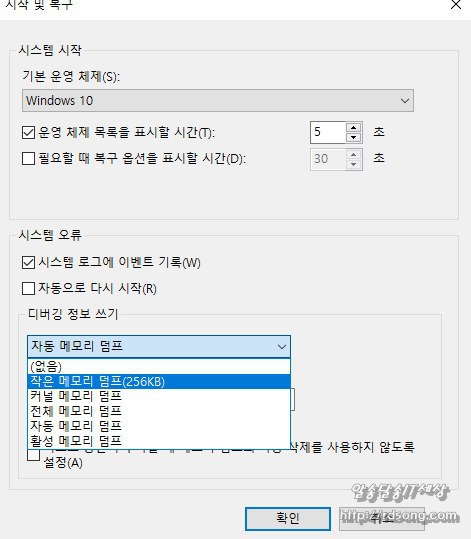 디버깅 정보 쓰기 파일을 작은 메모리 덤프 256KB로 설정을 해 둬도 되며 컴퓨터가 오류 또는 블루스크린 뜨게 되면 재부팅을 하지 않겠죠