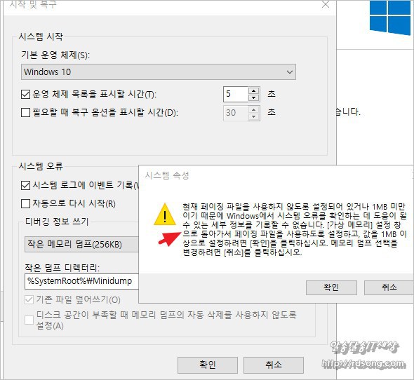 윈도우10에서 메모리 덤프 파일 생성하도록 작은 메모리 덤프로 설정을 해 놨더니만 아래처럼 페이징 파일을 최소 400MB 설정 해야 한다고 메시지가 뜹니다
