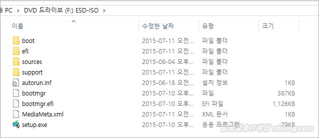 윈도우 10iso 다운로드 된 파일을 열어보면 윈도우10 설치용 CD파일들이 나타납니다
