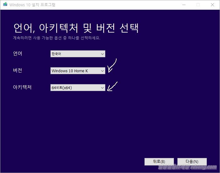 윈도우 10이 설치된 PC에서는 설치된 버젼과 아키텍처를 동일하게 선택하면 됩니다