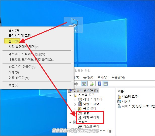 바탕화면 > 내PC > 마우스우측 버튼 > 관리 > 장치관리자 찾아 가면 됩니다.