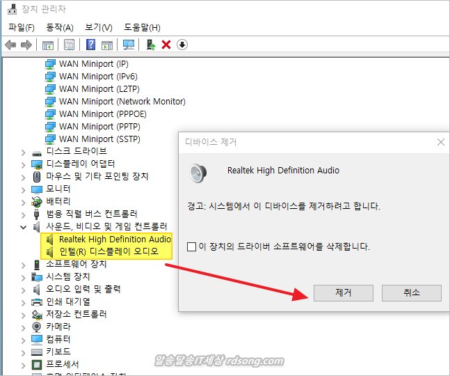 사운드 장치 각각 선택 > 키보드 delete > 제거 합니다. 2개 모두 제거 해 줍니다.
