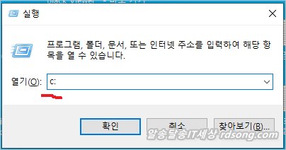 키보드 윈도우로고키 + R : 실행 창이 뜹니다. 여기서 c: 타이핑 하고 엔터 쳐 봅니다.