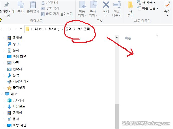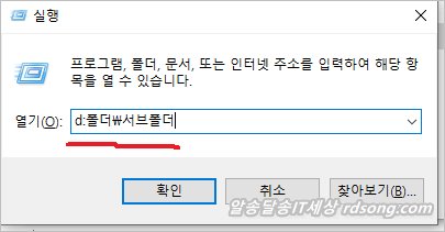실행창에서 [ d:폴더서브폴더 ]뜨도록 아래처럼 타이핑 하고 엔터 치면 해당 경로의 폴더로 바로 뜨게 됩니다.