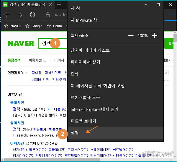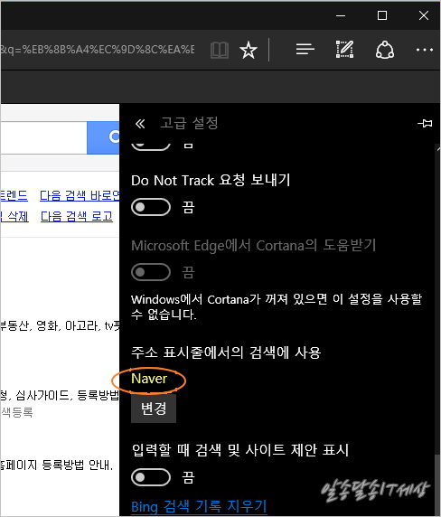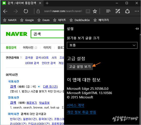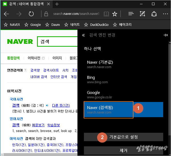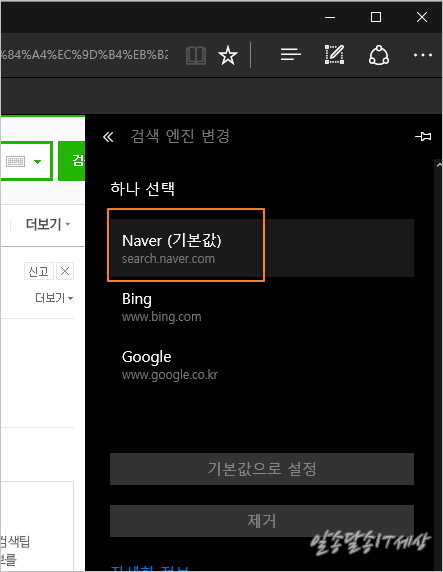 윈도우10 엣지 Edge 주소표시줄의 기본검색엔진을 네이버로 변경하는 방법