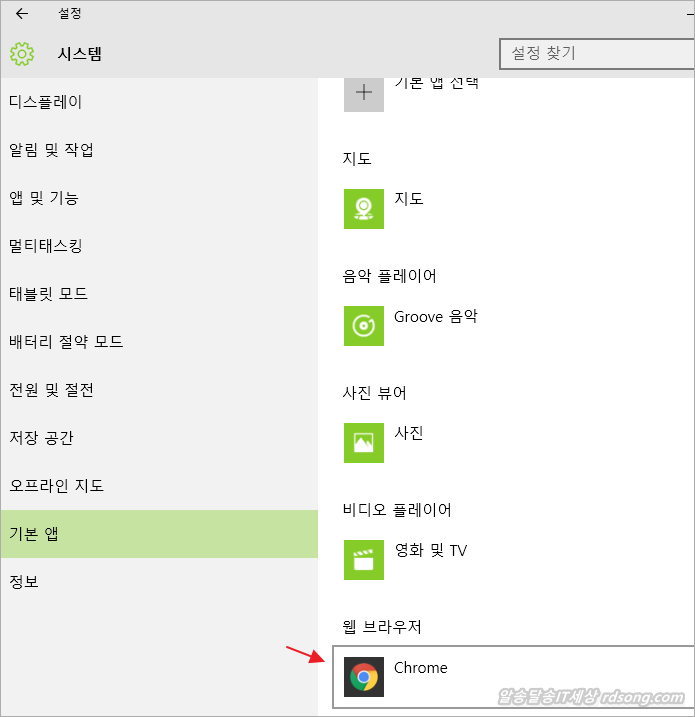 윈도우10 사용자라면 기본앱의 웹브라우져를 chrome으로 설정해야 합니다