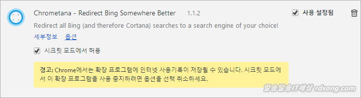 참고로, 시크릿모드에서 허용에 체크가 되어 있는데 크롬브라우져를 시크릿모드로 띄웠을 때 확장프로그램이 동작 됩니다