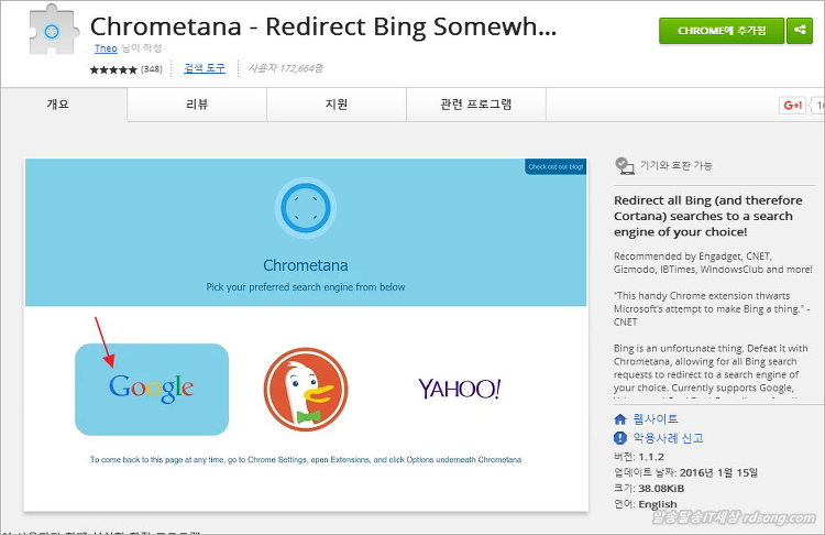 크롬 확장프로그램 chrometana – redirect Bing somewhere better 로 작동방법은, 윈도우10 작업표시줄에서 웹검색하면 크롬이 열리면서 bing 에서 리다이렉트로 구글검색이 구현되는 것이죠