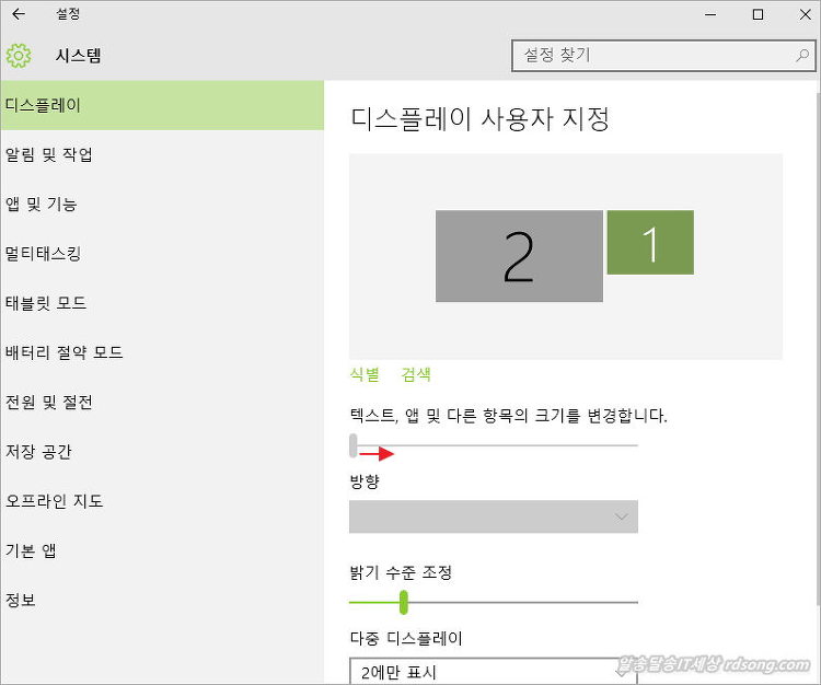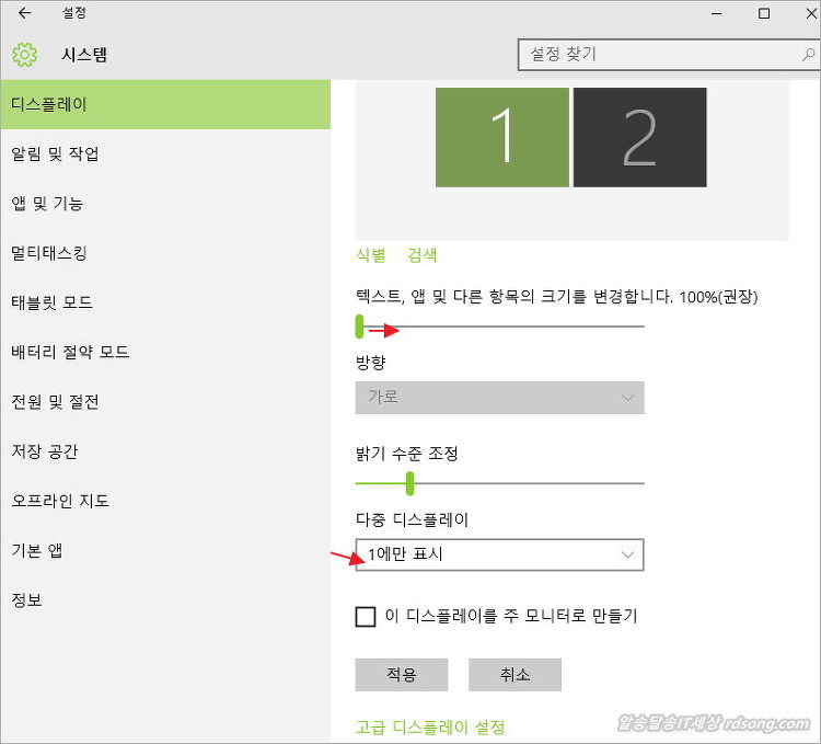 모니터가 1개를 쓰고 있다면 활성이 되어 바로 마우스로 막대기바를 우측으로 드레그 하면서 원하는 %크기를 선택하면 됩니다