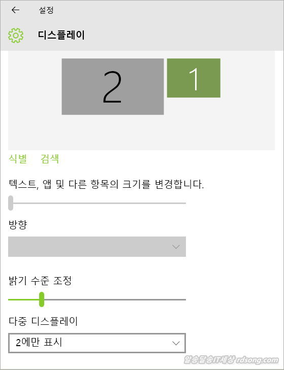 만약 ,듀얼모니터 설정하여 아래처럼 회색으로 비활성되어 있다면 원래의 디스플레이 화면, 다중디스플레이 에서 원래 다른 디스플레이 번호를 선택하면 활성이 되게 됩니다
