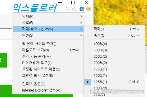 또한 익스플로러의 화면의 글자크기도 125%로 크게 됩니다 동시에 확대가 적용이 됩니다