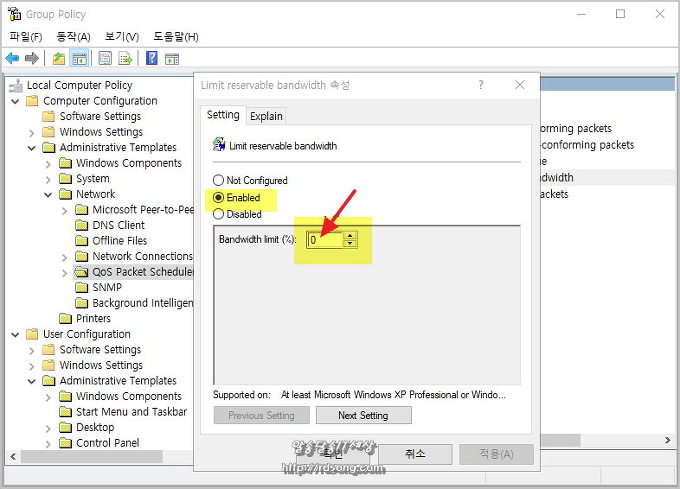 윈도우10 Qos 예약 대역폭 제한 해제 0 바꾸어 인터넷 속도 빠르게 쓰는 방법 마칩니다.