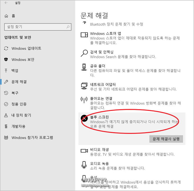 블루 스크린 문제 해결사 실행 을 해 봅니다