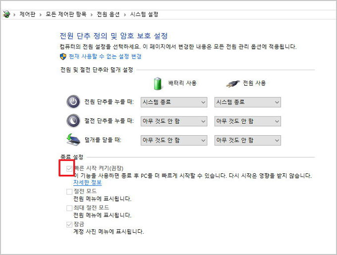 빠른시작 켜기(권장) 체크되어 권장사항이긴 하지만, 일단 꺼보자