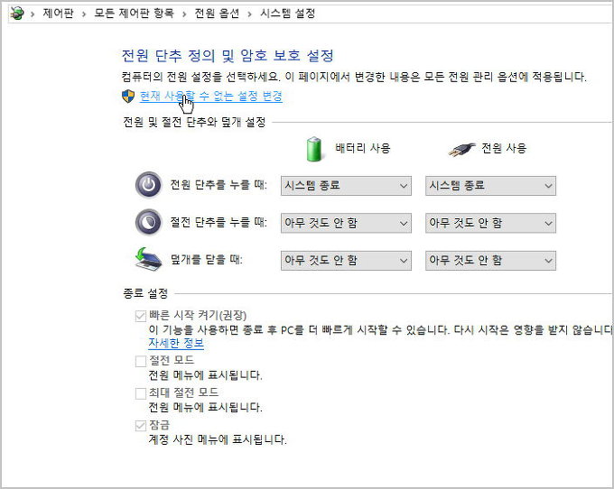 현재 사용할수 없는 설정 변경 을 선택하면 빠른 시작 켜기를 끌수 있다