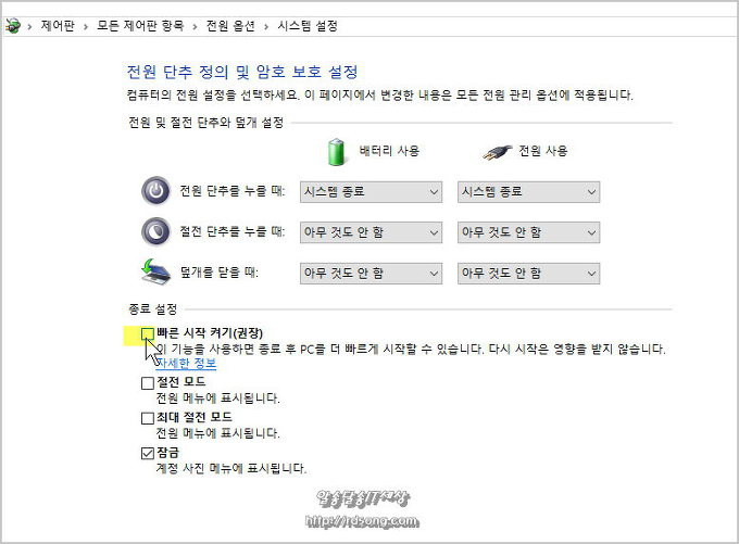윈도우10 빠른 시작 켜기 / 끄기 설정 방법