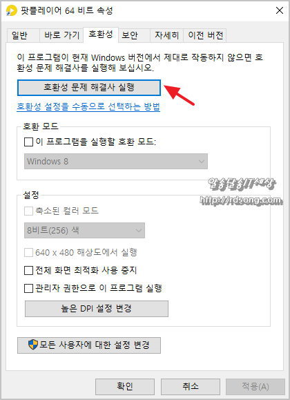 바탕화면의 팟플레이어 바로가기 속성 창에서 호환성 문제 해결사 샐행 방법 도 있다