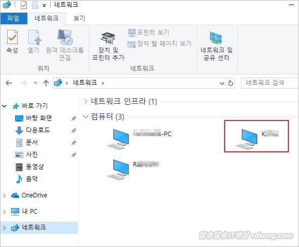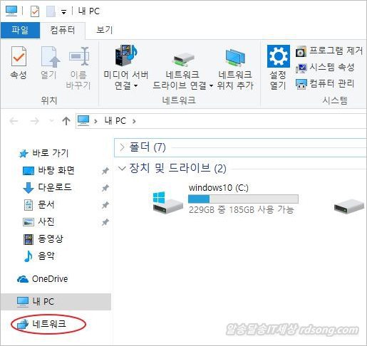 다른 윈도우10 컴퓨터의 탐색기 또는 내PC를 열면 좌측 하단에 네트워크가 있습니다