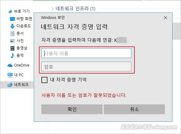 k컴퓨터를 선택하면 windows 보안 때문에 네트워크 자격증명 입력하는 창이 나오는데 이것은