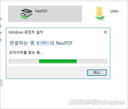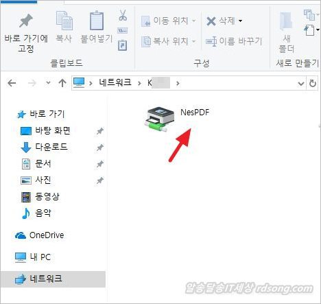 아래처럼 K컴퓨터의 공유된 프린터 nespdf 프린터가 정상적으로 뜹니다