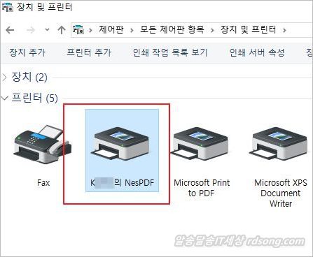 마지막으로 장치 프린터를 보면 k컴퓨터의 nespdf 프린터가 정상적으로 설치되어 있습니다