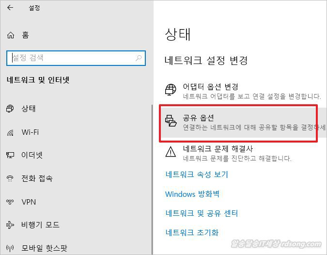 공유 옵션 , 연결하는 네트워크에 대해 공유할 항목을 결정하는 부분으로 프린터 공유 및 파일공유 할때 사용합니다