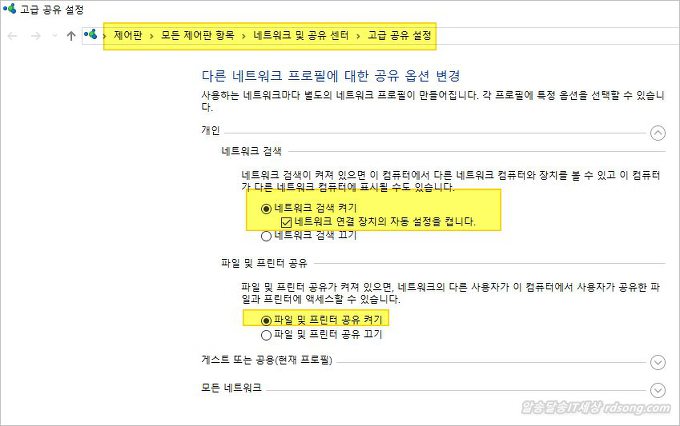 다른 네트워크 프로필에 대한 공유 옵션 변경 부분에서는