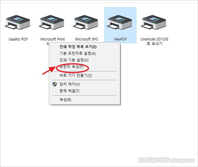 공유하고 싶은 프린터를 선택하고 마우스 우측을 눌러 프린터 속성으로 갑니다