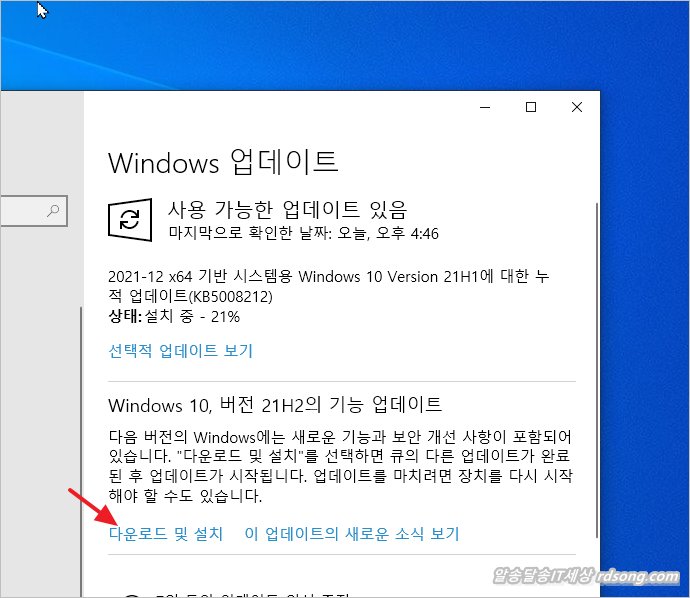 기존에 업데이트 있다면 미리 완료 하고 나서 윈도우 10 21H2 기능 업데이트 다운로드 설치를 시작 해야 합니다.