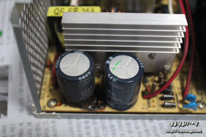 요즘 뻥파워가 많고, 정격이라고 갖추었다고 하나 제대로 승인 절차를 거치지 않은 컴퓨터 파워 제품들이 시중에 많아서 잘 구입하셔야 합니다 아래 그림에 보면 작은 콘덴서 하나가 맛이 갈랑말랑 한 상태입니다