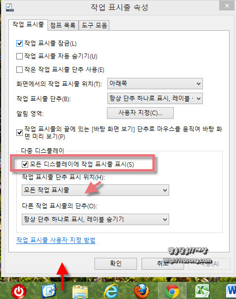 윈도우8의 다중 디스플레이에서 보조디스플레이와 모두 동시에 작업표시줄이 나타나게 하려면