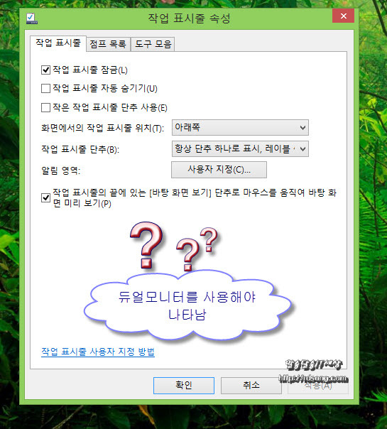 모니터를 하나만 사용하는 경우에는 , 윈도우8 작업표시줄의 속성에서 작업표시줄 설정옵션이 나타나지 않아요~