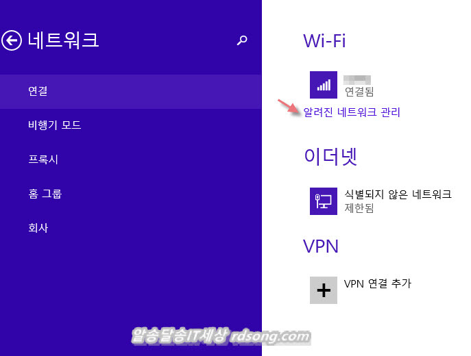 윈도우8.1에서 무선 연결 설정을 제거하는 메뉴 찾기가 호락호락 하지 않네요 이것 몇십분 동안 참바메뉴에서 허우적거렸네요