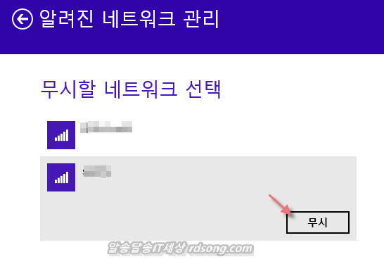 ▼무시할 네트워크 선택을 하고 ‘무시’를 누르면 무선연결 설정이 제거 삭제가 됩니다