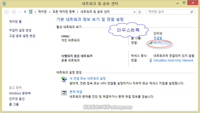 또는 윈도우8.1의 바탕화면의 작업표시줄 우측 하단의 마우스 우측을 눌러 네트워크연결에서 ‘네트워크 및 공유센터 열기’에서