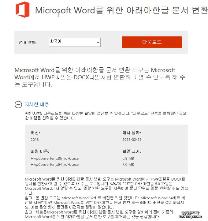 Microsoft Word를 위한 아래아한글 문서 변환 도구 다운로드