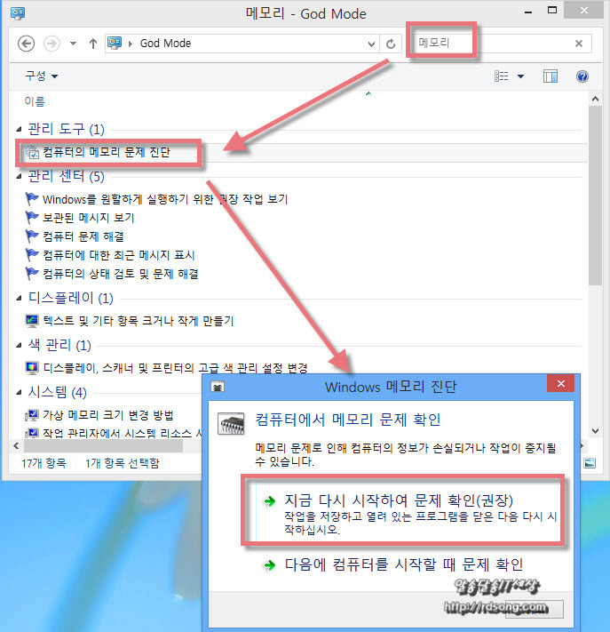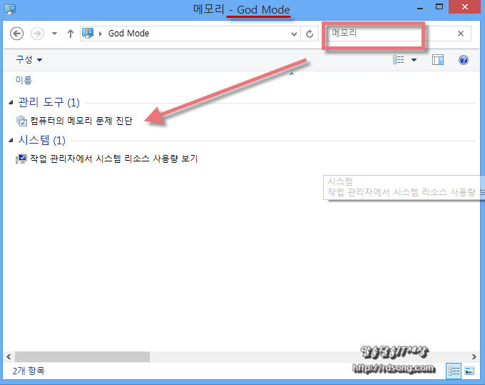 윈도우7과 윈도우8 역시 GOD모드를 지원하고 메모리를 검색하여 , 컴퓨터의 메모리 문제진단 마우스로 실행하면 됩니다