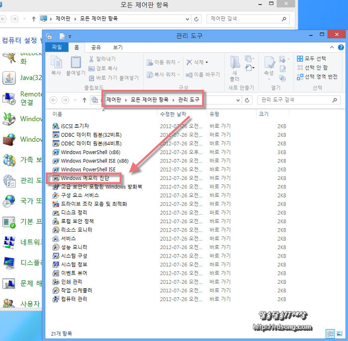 방법: 윈도우8의 제어판의 관리도구의 windows 메모리 진단을 눌러 실행합니다