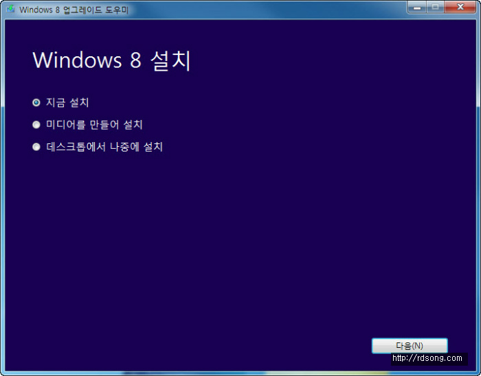 윈도우8 업그레이드 도우미를 통해서 업그레이드 진행하고 윈8 iso 이미지 파일을 다운로드 하고,사용자선택에 따라 즉시설치, 또는 메모리에 담아서 설치, iso이미파일 다운로드/저장 후 이미지 DVD 버닝후 설치, 전 버닝후 설치 진행했습니다
