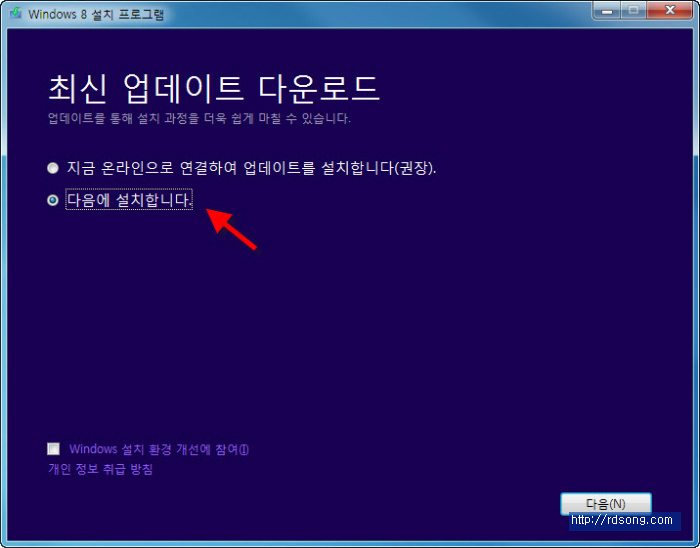 최신업데이트 다운로드는 설치 할 때 좀더 빠른 설치를 위해서 다음에 설치/ 윈도우 8 설치 후 나중에 진행예정