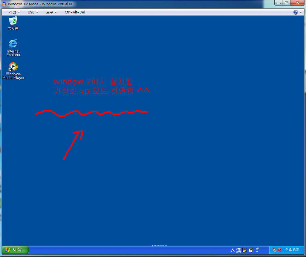 윈도우 xp 가상화 모드가 최종 완료 된 화면이며 , xp 사용자 계정은 나중에 다른계정으로 바꿔도 된다