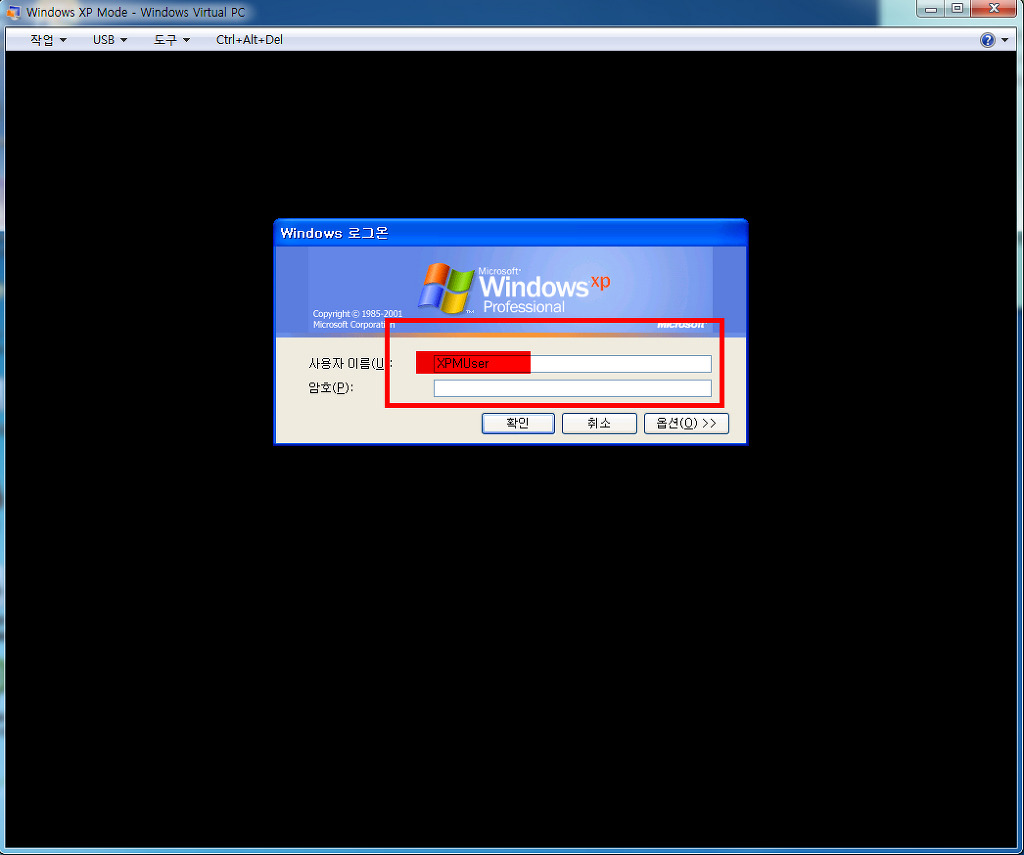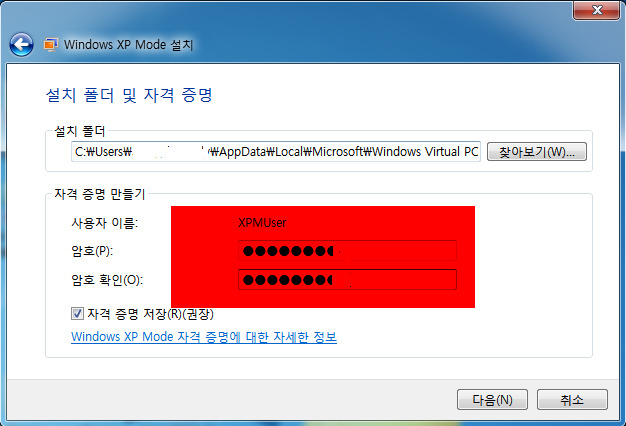 윈도우 xp모드에서 사용될 암호를 입력해 준다