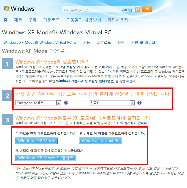 1.windows xp Mode – 파일 약 558M 다운로드 후 설치 해 준다