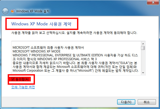 window xp mode 사용권 에 동의 한 후 다음단계로 진행하면