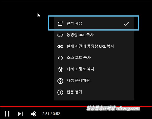 재생중인 유튜브 동영상 위에 마우스 우측 버튼 누르면 아래처럼 연속재생 눌러 주면 됩니다.