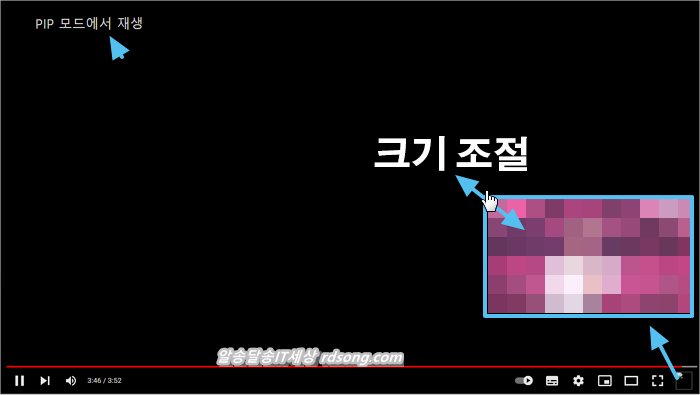 pip 모드 플로팅 플레이어 화면 크기 조절 할수 있고, 마우스 이용하여 위치 이동을 해 주면 됩니다.