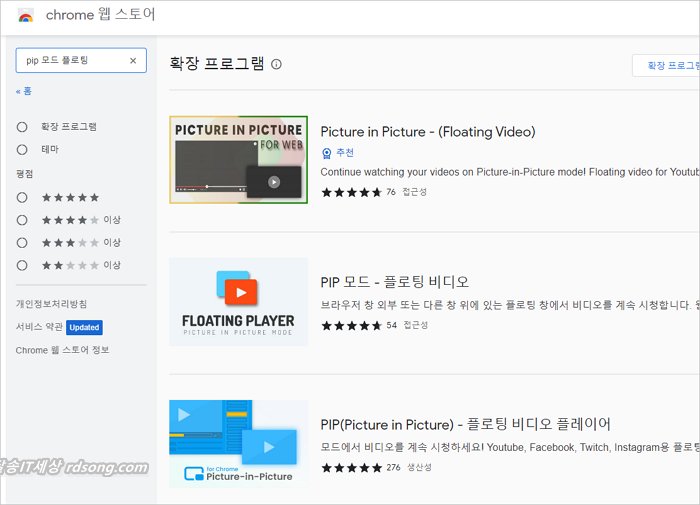 여기서 pip 모드 검색 해 봅니다. 그럼 pip 모드 플로팅 비디오 picture in picture 크롬 확장프로그램 찾을 수 있습니다.