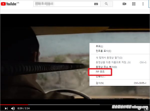 재생중인 유튜브 동영상 위에 마우스 우측버튼 누르면 아래처럼 pip 모드 선택하면 됩니다