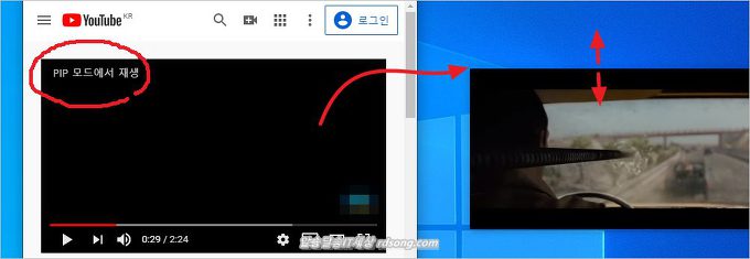컴퓨터 바탕화면에 pip 모드에서 재생 되고 있으며, 재생되는 화면창 크기 줄이고 늘리고, 마우스로 원하는 위치로, 드레그 하면 이동도 가능 합니다.