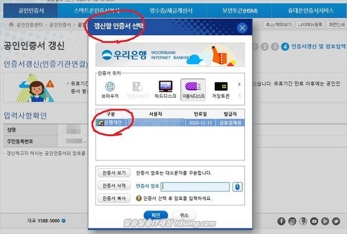 그러면 갱신 할 인증서 선택 화면 창이 뜹니다. 발급자 : 금융결제원 되어 있지만 공인인증서 발급기관 사용자마다 다를 수 있습니다.